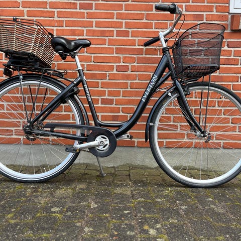 En god klassisk Everton damecykel som er køreklar med kurv begge sider og garanti lås med to nøgler ,ringe klokker , 7 gear, støtte ben , fod bremse , juster bar sadel og styr , stel str. 51 cm . Lav stigning.