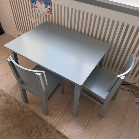 De Blå stole har en behagelig højde og passer perfekt sammen med det Grønne børnebord.