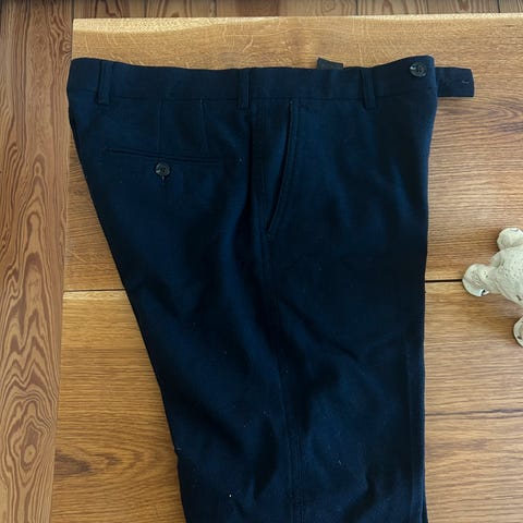 Samsøe Samsøe herrebukser i mørkeblå i størrelse 44. Yderstof består af 50 % uld og 50 % polyester. Foret er lavet af 45 % viskose og 55 % polyester. Bukserne har bæltestropper i taljen, knap- og lynlåslukning foran samt paspolerede baglommer med knaplukning. Velegnet som pæne bukser til hverdag eller formelle anledninger.