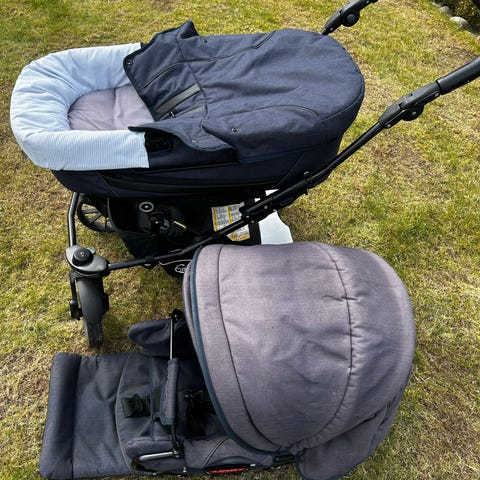 Emmeljunga duo vogn. Liggemål 80 i barnevognsdel, men langt liggemål i klapvogn (3-4 år). Slid på håndtag og misfarvningning i stoffet. Se billeder. Det ene hjul siger en lyd. Kører ellers fint. Medfølger en ekstra åndbar madras, myggenet, regnslag og solskærm.