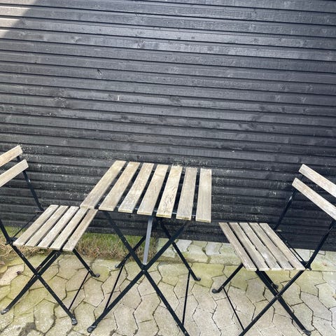Havecafé sæt med rundt bord og 2 stole i metal. Sættet består af et rundt bord med dekorativt udskåret bordplade og to matchende stole med udskårne rygge og sæder. Farven er mørk, sortlig metal med patineret udtryk. Egnet til brug på terrasse, altan eller i have som lille cafésæt.