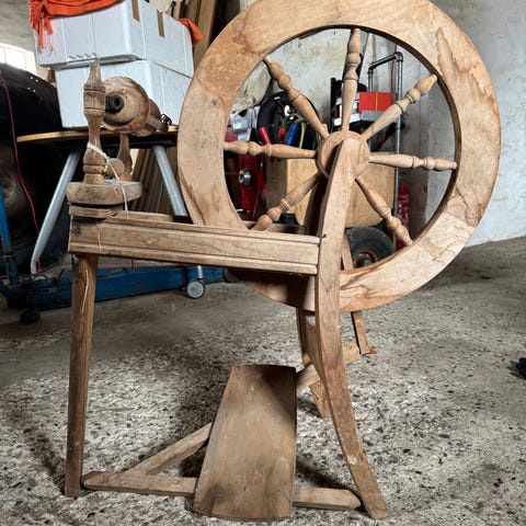 Klassisk danskproduceret spinderok incl. spoler, karter og en "garnvinder". sælges helst samlet.