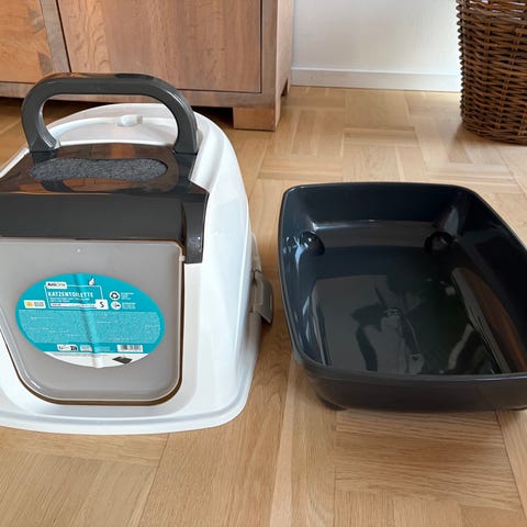 Catit kattetoilet i åben model. Kattetoilettet er fremstillet i hvid plast med integrerede bærehåndtag i siderne. Fronten er lav for lettere adgang for katten, mens sider og bagkant er højere for at holde grus inde. På siden hænger en matchende grusske i plast. Velegnet til indendørs brug til kattegrus og som standard kattetoilet.