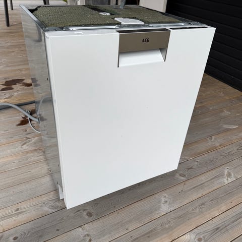 AEG underbygget opvaskemaskine i hvid. Modellen er beregnet til montering under bordplade i køkken. Fronten fremstår i hvidt design, og betjeningspanelet er placeret øverst på lågen. Velegnet til standard køkkenelementer med underbygget installation. Sælges da vi skal renovere køkken.
