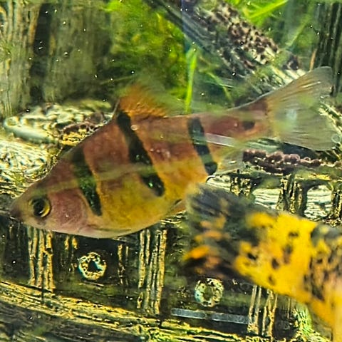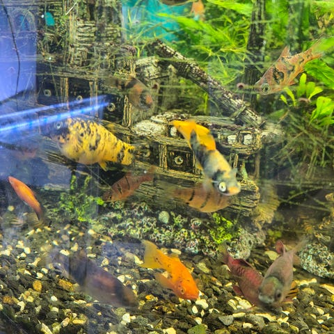 Sorte sejlfinne mollyer (enkelte sort dalmatiner) i voksne og små, enkelte er uden sejl.