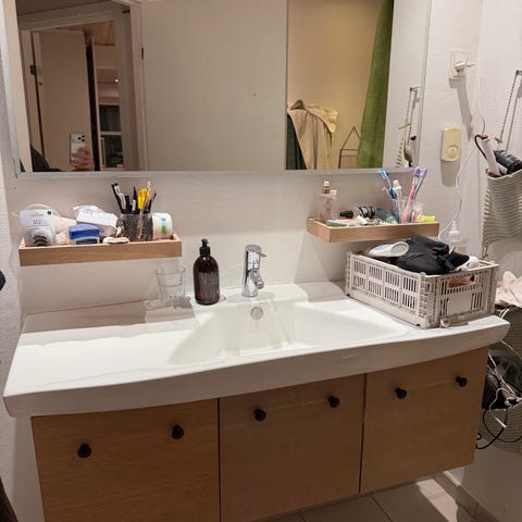 To Badeværelsesmøbel med vask bestående af et skabe i trælook med to skuffer og en hvid rektangulær keramisk vask. Skabet har integrerede metalskinner til skufferne og lange greb på fronten.