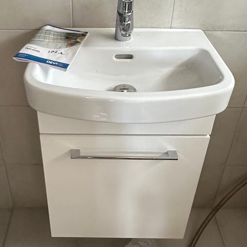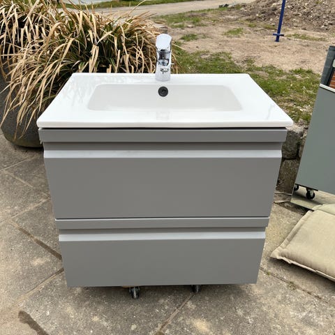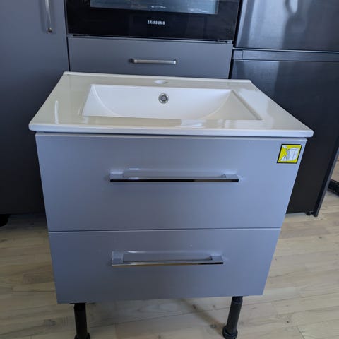 Vasken har ét hul til armatur og afløb i midten. Velegnet som komplet løsning til montering på badeværelse, hvor der ønskes opbevaring i skuffer under vasken.