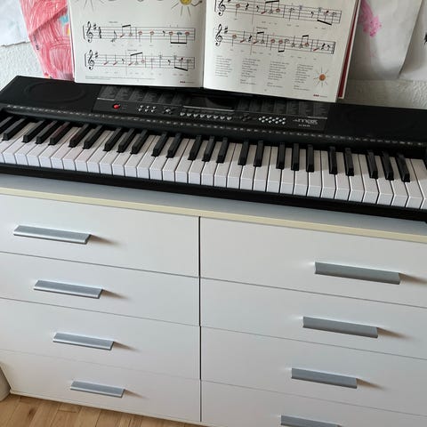 Lorgar DK6100 elektronisk keyboard med 61 fuldstørrelse tangenter i sort og sølv. Keyboardet har indbyggede højttalere, digital display i midten samt flere funktionsknapper til lydvalg, rytmer og indstillinger. Egnet til øvning, undervisning og generel musikudøvelse i hjemmet eller øvelokalet.