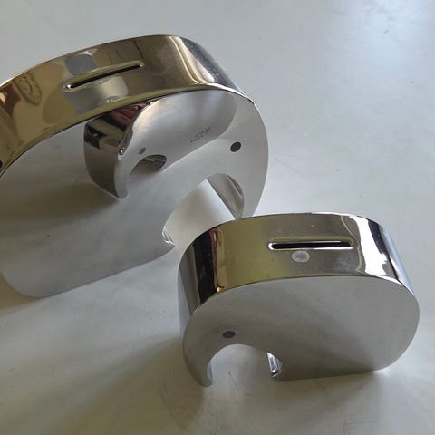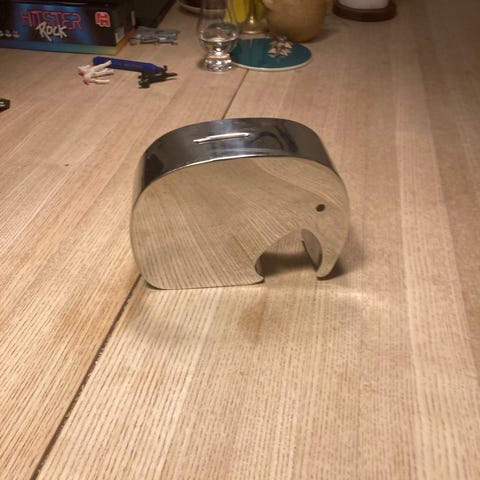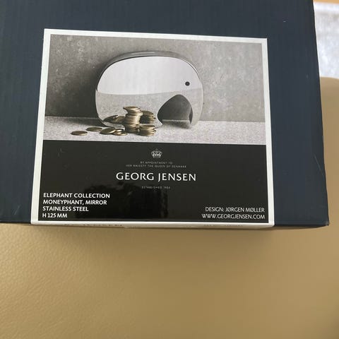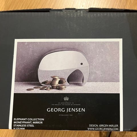 Georg Jensen Moneyphant/ sparebøsse med tvillinger i træ. Sættet består af elefantformet sparebøsse i rustfrit stål samt to små træ elefanter. Den perfekte dåbsgave eller blot som dekoration i hjemmet. Kun stået fremme kort tid.