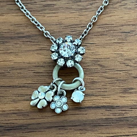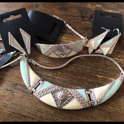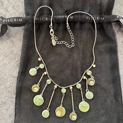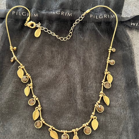 Pilgrim smykkesæt bestående af halskæde og armbånd til kvinde. Smykkerne er forgyldte og har vedhæng formet som blade og små runde elementer. Halskæden har flere tynde kæder og justerbar længde med forlængerkæde. Armbåndet har matchende design med justerbar lukning. Sættet leveres med Pilgrim-pose som på billederne.