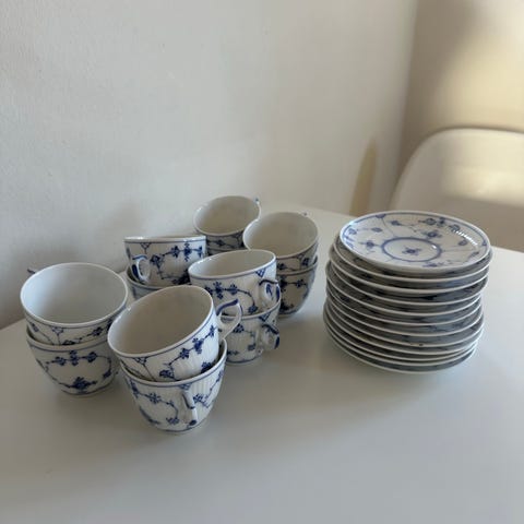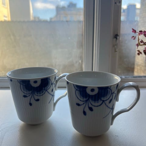 Royal Copenhagen kopper i blå-hvidt porcelæn. Sættet består af fire kopper med håndmalet dekoration i klassisk Royal Copenhagen-stil. Kopperne er uden hank og har glaseret inderside og yderside med blå dekoration. Velegnet til fx kaffe, te eller andre varme drikke samt som små serveringsskåle. Porcelænet er mærket Royal Copenhagen i bunden. 4 styk