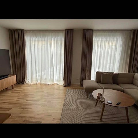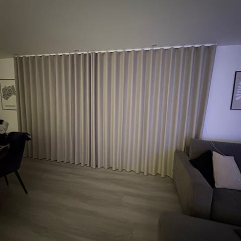 Stofgardiner i lys gul/varm beige nuance. Gardinerne er let transparente og giver et blødt lysindfald i rummet. Velegnet til stue, soveværelse eller andre opholdsrum, hvor der ønskes afskærmning uden at lukke dagslyset ude. Ophæng ses som bølgeformede længder på skinne i loftet. Materialet fremstår som et let, vævet tekstil med ensartet struktur. Smukke sartgule stofgardiner der lader lyset komme ind i stuen, men samtidig giver privatliv. Se mål og flere detaljer på billeder. Nypris 11.760kr. Købt i sommeren 2025.