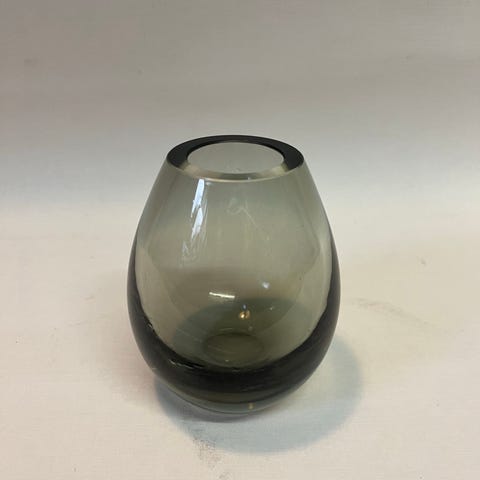 Glasvase i bølgeformet design. Vasen er fremstillet i røgfarvet glas og har en organisk, blødt bølgende kant hele vejen rundt. Egnet til brug som dekorativ vase til blomster eller som skål til mindre genstande. Passer til indretning i stue, køkken eller entré.