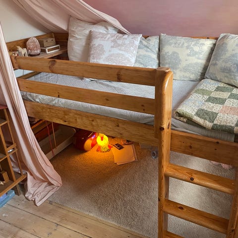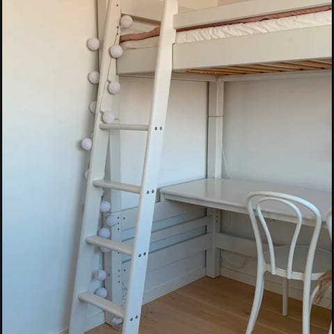 Højseng til børn i lyst træ med integreret stige. Sengen er hævet fra gulvet og giver mulighed for opbevaring eller leg under sengen. Den har sengebund med lameller og er velegnet til et børneværelse, hvor man ønsker ekstra gulvplads under sovepladsen.