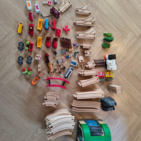 BRIO togbane med trætog og træs kinner. Sættet omfatter forskellige tog, vogne og tilbehør som broer, station og bygninger. Delene er udført primært i træ med enkelte plastdele. Egnet som legetøj til børn, der kan bygge og udvide deres egen togbane og lave forskellige togruter og opstillinger.