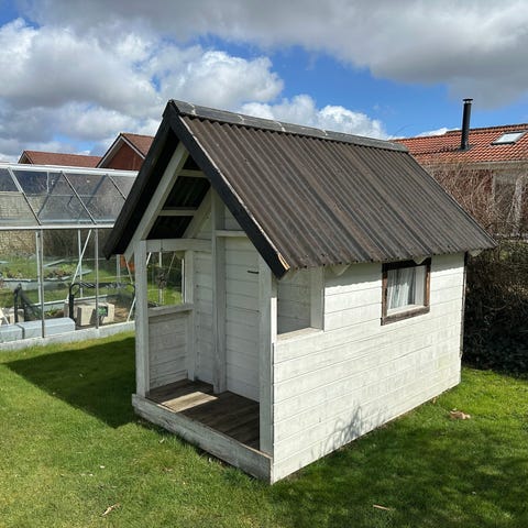 Fint legehus, bygget i 2020. Fin hems. Tagpap på taget. Køber fragter den selv ud af have. Måler 2,4 x2,2