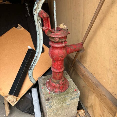 Klassisk manuel pumpe i rødmalet metal. Robust konstruktion med håndtag og tud til afløb af vand. Denne er dog ikke tilsluttet brønd, så ved ikke om den reelt virker. Har kun stået som dekoration.