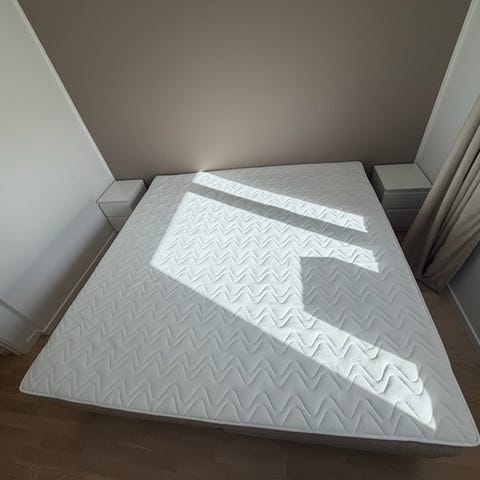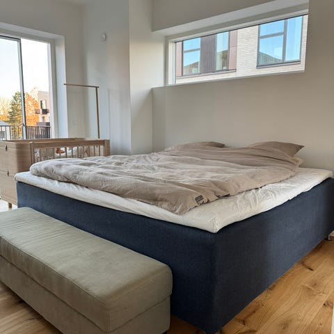 Continental, Sengetid, b: 210 l: 210, En kontinentalseng i størrelsen 210x210 er en king-size størrelse med plads til hele familien. Her får du ekstra god plads, både i bredden og i længden. Sengen er 210 cm i længden og derfor 10 cm længere end normale dobbeltsenge og en smule højere. Den er 70 cm høj. Den er i to dele og hver seng er på 105cm. Det er kun top madrassen der er i fuldt bredde og kan rulles sammen. Vi har været super glade for sengen men har brug for en mindre, da vi bygger om. Ingen pletter og sengen har været brugt med rullemadras. Ekstra høje træben er blevet købt samt midter ben i træ og sengen er inkl sengegavl (4000kr) og topmadras. Sengen har en højde på 75cm og står rigtig fint. Sengegavlen er altid blevet brugt med puder derfor ingen slid og har heller ikke stået i direkte sol lys så der er ingen sol blegning på gavlen eller sengen. Nypris knap 40.000kr.