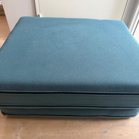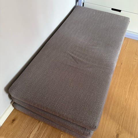 Foldemadras med sandfarvet/beige betræk. Madrassen har bonded skum og brune knapper og brunt håndtag.