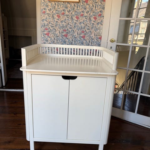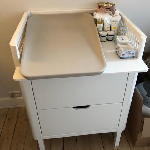 Sebra puslebord i hvid. Puslebordet har høje tremmekanter på tre sider omkring puslefladen for at give ekstra afskærmning. Under puslepladen er der to åbne hylder til opbevaring af bleer, tøj og plejeprodukter. Velegnet til brug på børneværelset eller i badeværelset som fast pusleplads.