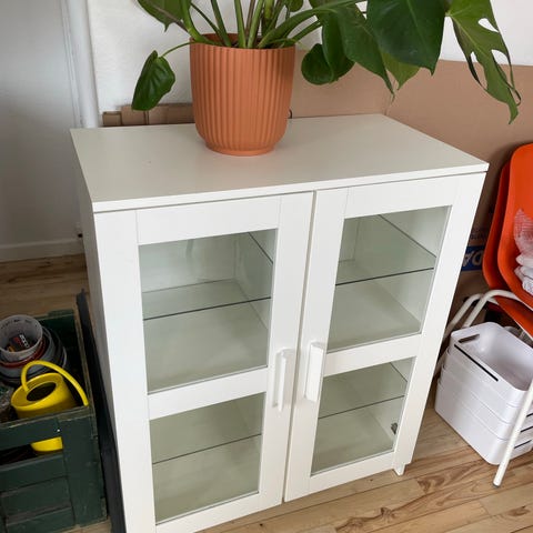 Sort vitrineskab med glaspartier foran og på siderne. Kan afhentes på Østerbro.