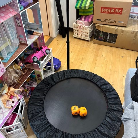 Fitnesstrampolin med håndtag i sekskantet form. Rammen er sort med grøn kant rundt om springfladen. Trampolinen er velegnet til indendørs fitnesstræning, fx hoppe- og balanceøvelser. Håndtaget giver ekstra støtte under træningen og kan bruges til forskellige typer øvelser. Passer til både hjemmetræning og holdtræning i mindre rum.