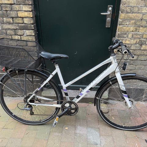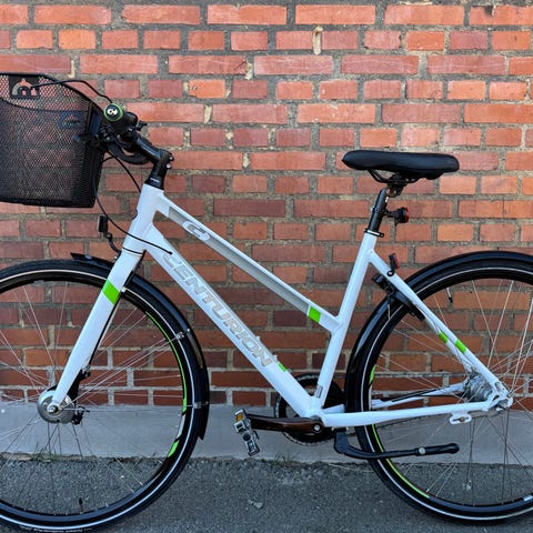Brugt men fejlfri, kørerklar og velholdt. Hjul str. 28”, fod og håndbremse. Den kører som den skal. Ny kurv, lygter og fast montere lås med 2 nøgler følger med.