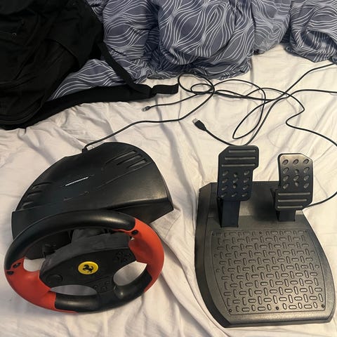 Thrustmaster Ferrari 458 Spider racing wheel med tilhørende pedal sæt. Rattet er udformet med Ferrari 458 Spider-design og har indbyggede knapper til Xbox-styring. Pedalsættet består af gas- og bremsepedal monteret på en base med skridsikker overflade. Velegnet til bilspil på kompatible Xbox-konsoller, hvor der ønskes mere præcis styring med rat og pedaler i stedet for standardcontroller.