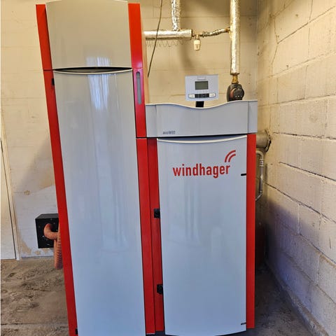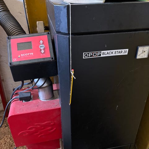 OPOP H 418 pillefyr med tilhørende magasin og elektronisk styring. Fyrret er fritstående og tilsluttes eksisterende varmeanlæg. Magasinet er placeret ved siden af fyret og føder brændsel via snegl. Styringen er monteret på væg og viser anlæggets opbygning med kedel, magasin og evt. varmtvandsbeholder. Velegnet til opvarmning af bygninger via centralvarmesystem med radiatorer eller gulvvarme, hvor der ønskes automatisk fyring med træpiller. Bliver nedtaget i maj måned.