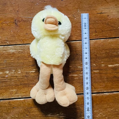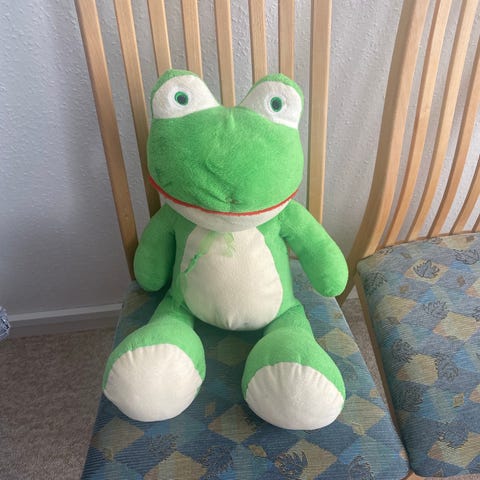plysdyr formet som en frø i grønne og gule nuancer. Figuren har store, runde øjne og er fremstillet som et blødt legetøjsdyr. Velegnet som krammedyr eller som del af en samling af Ty plysdyr. Størrelsen fremgår af billederne med lineal ved siden af legetøjet.