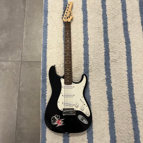 Elektrisk guitar i sort finish med lyst gribebræt og tremolo. Guitaren har tre single-coil pickupper og klassisk Strat-lignende opsætning med volumen- og tonekontroller samt 5-vejs pickupvælger. Medfølgende Behringer V-Tone GM108 guitarforstærker med flere indstillingsmuligheder på frontpanelet, herunder gain, volumen, EQ og voicing. Der følger desuden en blød gigbag til opbevaring og transport samt en guitarrem med mønster.