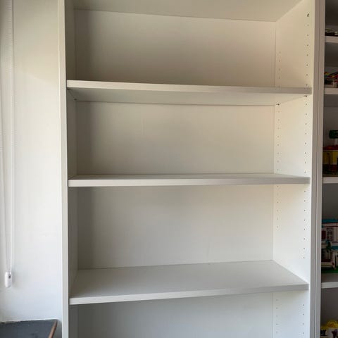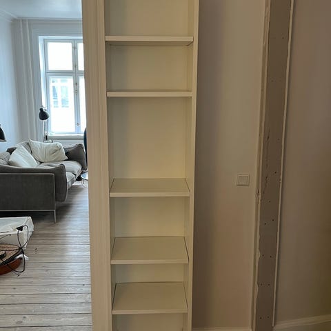 Billy reol fra IKEA, flytbare hylder så man kan tilpasse afstanden mellem hylderne efter behov.
