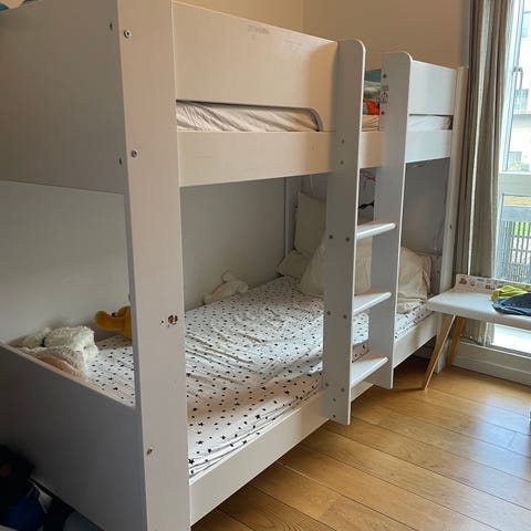 Køjeseng i hvidmalet træ til børn. Sengen har to liggepladser placeret over hinanden og fast integreret stige i gavlen. Velegnet til børneværelse, hvor der ønskes to sovepladser på begrænset plads. Klassisk, enkel udformning med høje gavle og sider omkring øverste køje for øget afskærmning. Passer til standard enkeltsengsmadrasser (mål ikke oplyst).