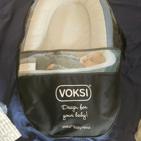 Der medfølger en slidt men fuld funktionel voksipose som er blevet syet længere (det grå stykke) så den passer til krybbens længde. Der er både vinter- og sommerdyne til voksiposen, som også er blevet syet længere.