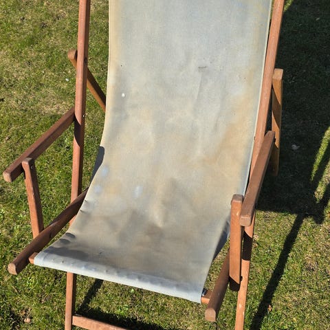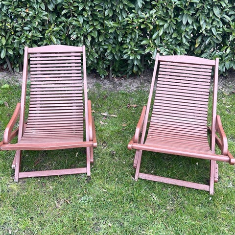 Liggestol i træ med lilla stofsæde og nakkepude. Stolen har justerbar ryglænsvinkel og sammenklappeligt stel, som gør den egnet til brug på terrasse, altan eller i haven. Trærammen er udformet med armlæn for ekstra støtte, og stoffet er spændt ud i hele stolens længde, så kroppen får fuld liggeflade.