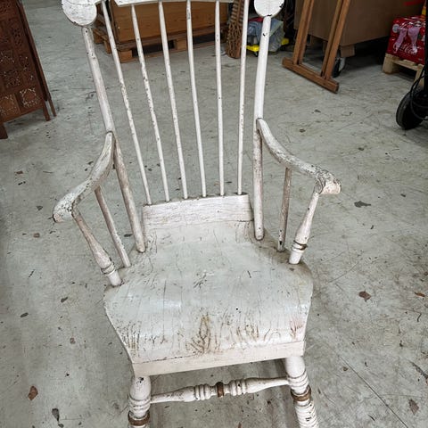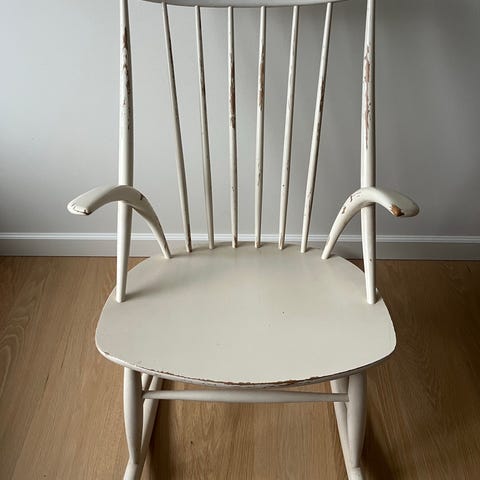 Fin lille gyngestol med bredt sæde. Den har tydelige brugsmærker, som ses på billederne og knirker lidt, men fungerer ellers ganske fint.