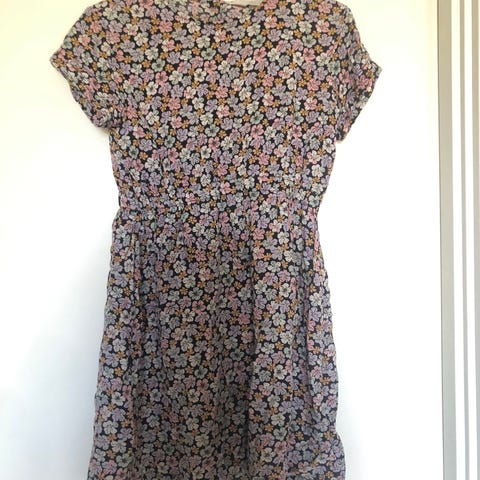 Fin festkjole med stedmoderblomster - størrelsen passer til en gennemsnitlig 14-15-årig. Brugt til nonfirmation, sammen med Levi´s denimjakke (se anden annonce)