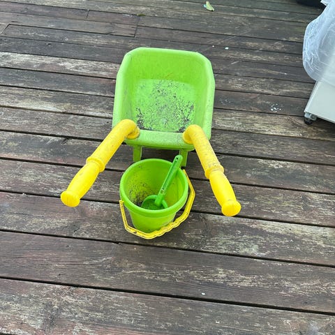 Trillebør til leg i haven. Den røde farve på håndtagene er lidt falmede. Se billeder