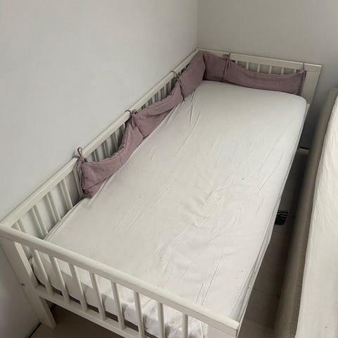 IKEA juniorseng i hvidlakeret metal. Sengen har tremmegavle i begge ender og sider, som giver god afskærmning til barnet. Velegnet som overgangsseng mellem tremmeseng og almindelig seng. Passer til standard junior-madras (mål ikke oplyst). Neutral farve og enkelt design, der kan indpasses i de fleste børneværelser.