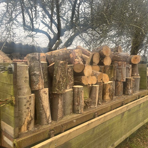 Fældet for 4 år siden. Har ligget ude hele tiden. Meget store stykker der kun kan løftes af 2 meget stærke mænd, ellers skal de flækkes før løft.