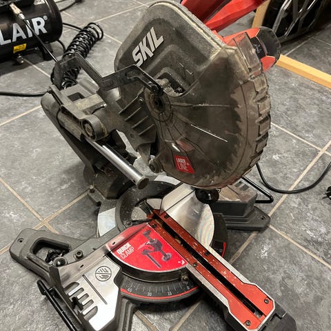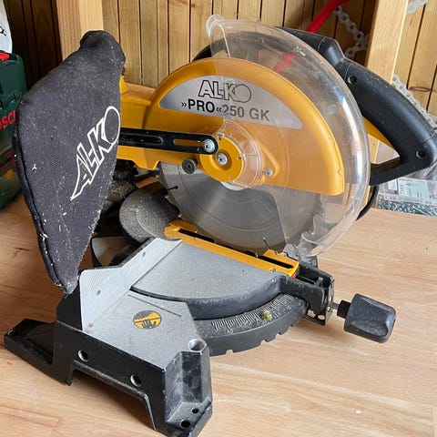 Skil kap-/geringssav med rundsavklinge og integreret bord til geringssnit. Saven har justerbar geringsvinkel markeret på bundpladen og beskyttelsesskjold over klingen. Udstyret med støvpose bagtil til opsamling af savsmuld samt håndtag til betjening af nedtræk. Egnet til præcisionssnit i træ og lignende materialer i værksted eller på byggeplads.