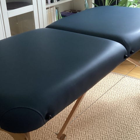 Earthlite transportabel massagebriks med træstel i blå polstring. Briksen har sammenklappeligt design med bærehåndtag, så den kan transporteres og opbevares efter behov. Understellet er udført i træ med wire-forstærkning for stabilitet. Liggefladen er polstret og opdelt i to sektioner. Der medfølger justerbar ansigtsstøtte og armlænshylde, bæretaske samt halvrund jumbo hynde. Velegnet til massage, kropsterapi og lignende behandlinger i klinik eller hjemme.