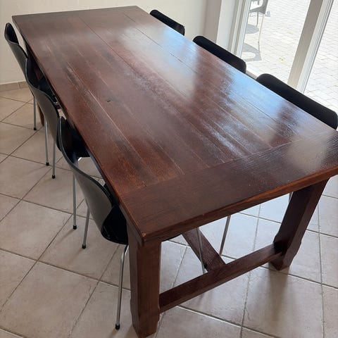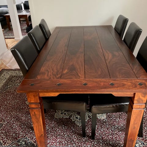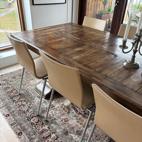 Fedeste langbord i egetræ, dertil 6 stole med lyst kernelæder.