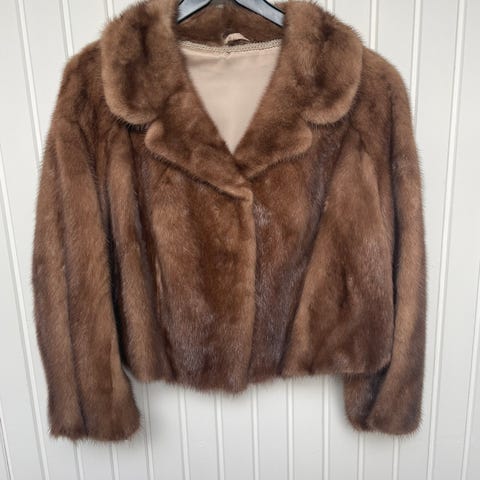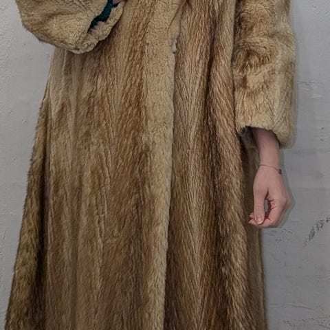 Brun Saga minkpelsfrakke til kvinder i størrelse M. Lang model med lange ærmer og klassisk krave.
