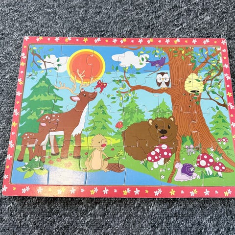 Træpuslespil med dyremotiv i flere farver. Består af en træplade med udskårne felter og løse brikker formet som dyr og naturmotiver. Brikkerne samles i rammen, så de danner et samlet billede med blandt andet elefanter og andre dyr omgivet af træer og planter. Egnet som aktivitetslegetøj, der kan støtte finmotorik og formgenkendelse hos børn.