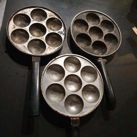 Æbleskivepande, Meget gammel i smedejern med belægning. Magnetisk. Ø 21,5.