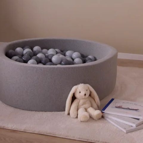 120x120x40 cm lækkert og vedligeholdt boldbassin i grå stof og quilted imiteret øko-læder. Medfølger 400-500 bolde. Vil man have rutsjebanen kan man få den gratis med. Rutsjebanen har nogle overfladiske skrammer og lidt revner, men er robust og stabil ellers.