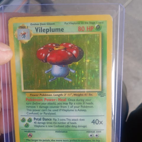 Pokémon Vileplume samlekort i holografisk udgave. Kortet viser Vileplume med 80 HP og angreb som blandt andet Petal Dance. Egnet til samling eller som spilkort i Pokémon Trading Card Game. Oplysninger om sæt, årgang og sprog fremgår af billederne på kortet.