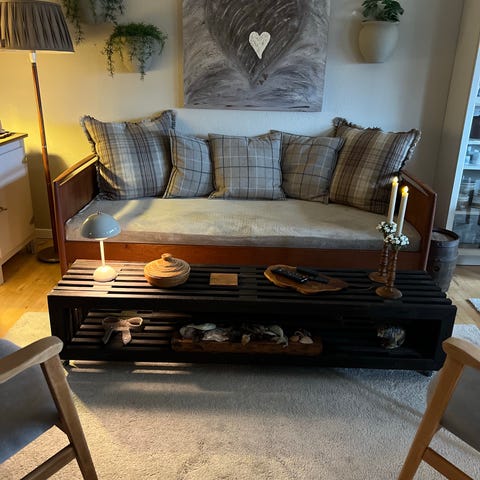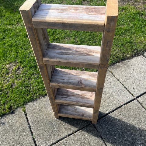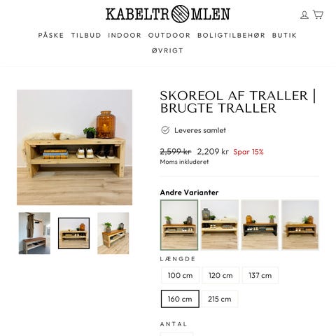 Fin træbænk fra Kabeltromlen. I øjeblikket bruges den som skoreol , men kan også bruges til fx TV-møbel