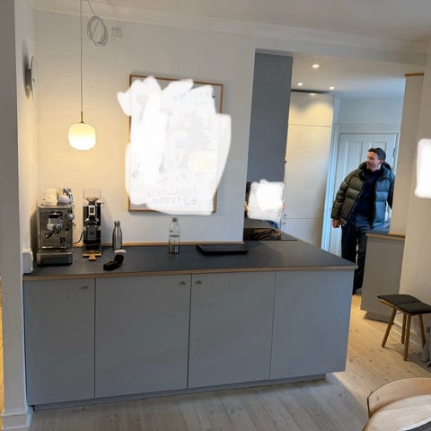 Køkken med skab, bordplade, og hvidevarer